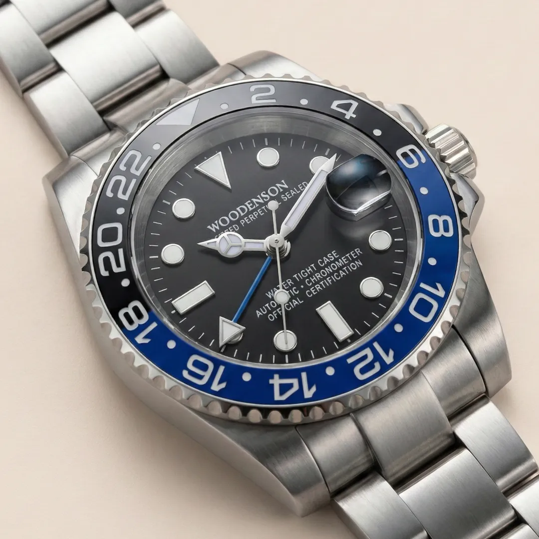 Funciones: Hora, fecha, GMT (3 agujas + manecilla adicional GMT)